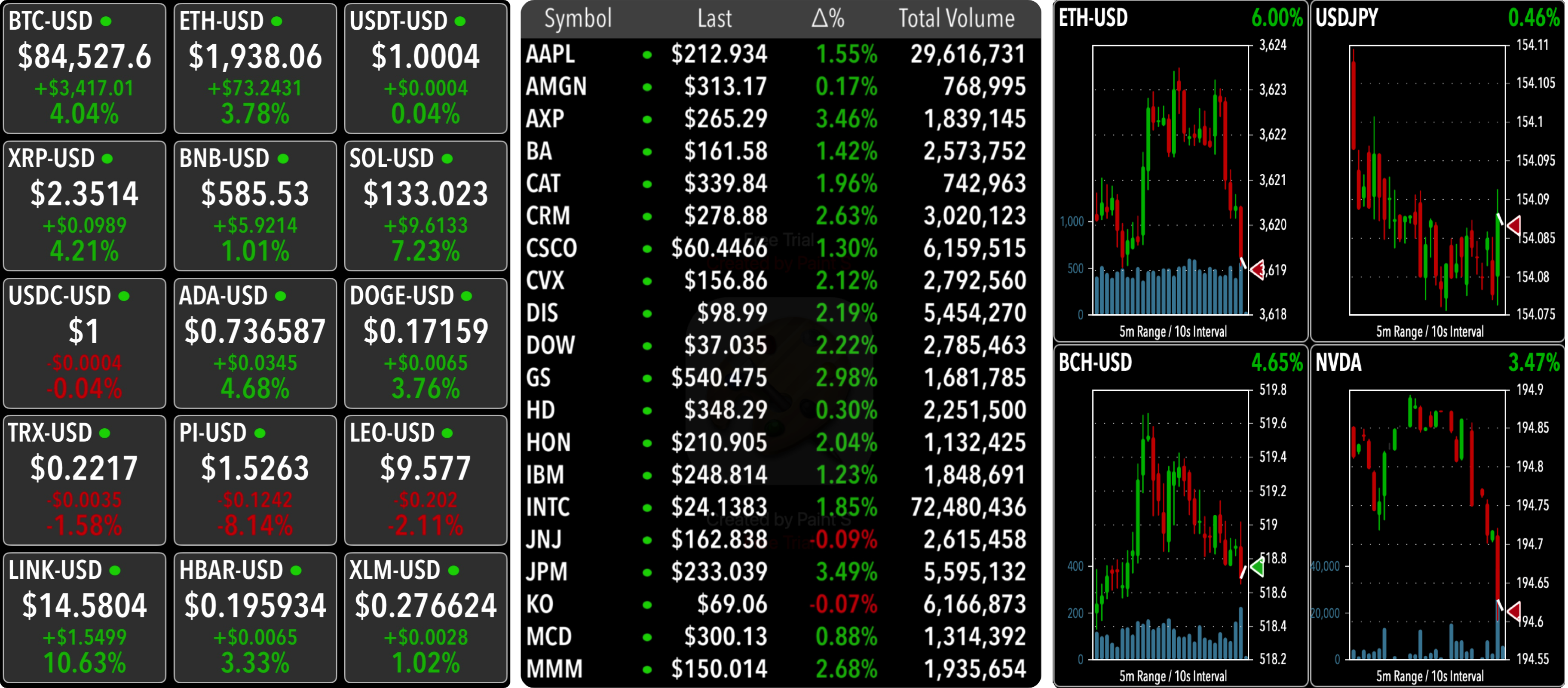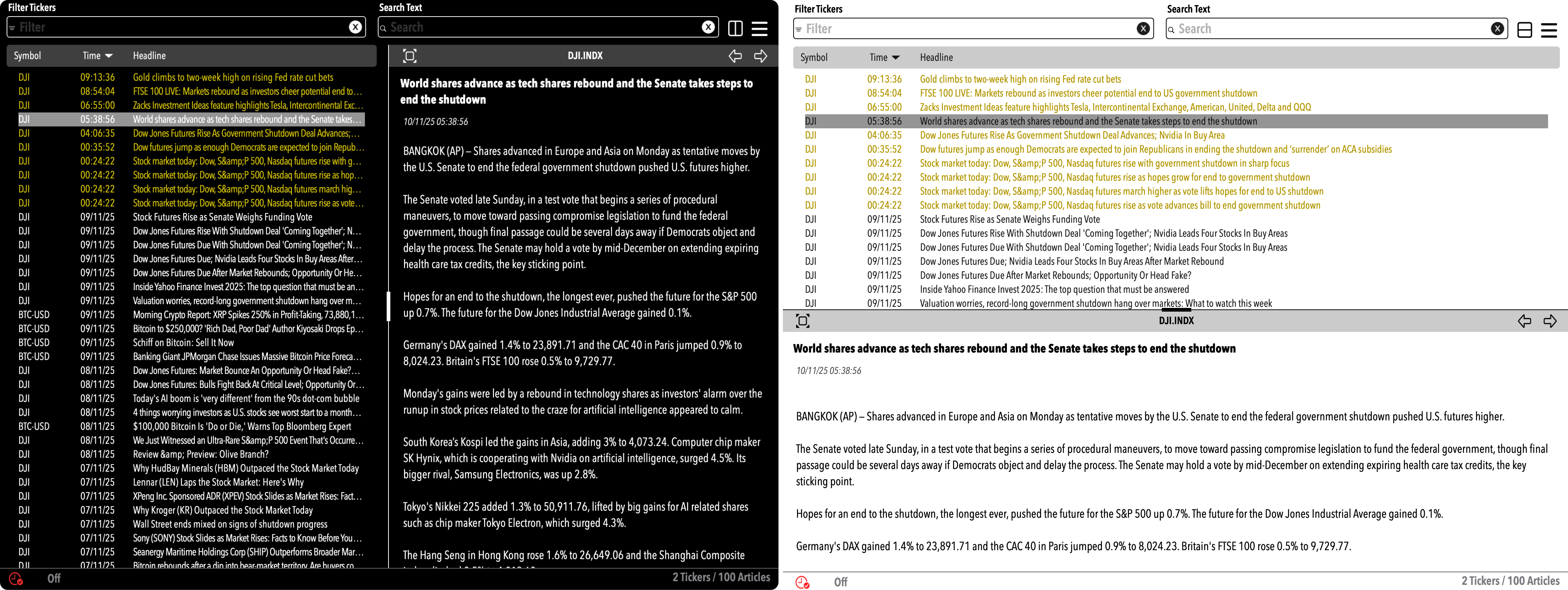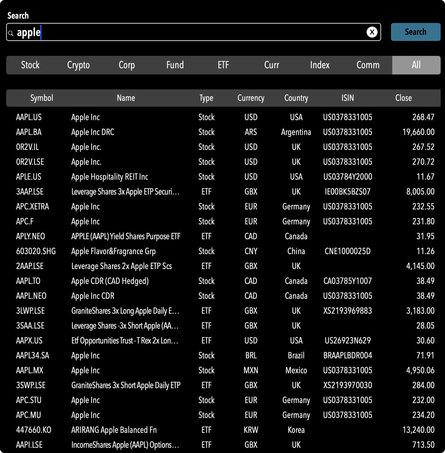 Chose your favorite display mode: tiles, tables, colored moves. Rearrange order just by dragging, get news or charts with one click. Plot several securities at once, automatically rebasing relative performance. Add many indicators to your chart, change all their parameters, chose different styles: candlesticks, bar charts or lines. Plot split-adjusted data or raw, use different scales (price, log or percent) and add or remove gridlines and scale labels. Search news by ticker, by text, quickly scroll through headlines and articles. Powerful integrated search engine for all types of securities, that can be quickly added to your monitors