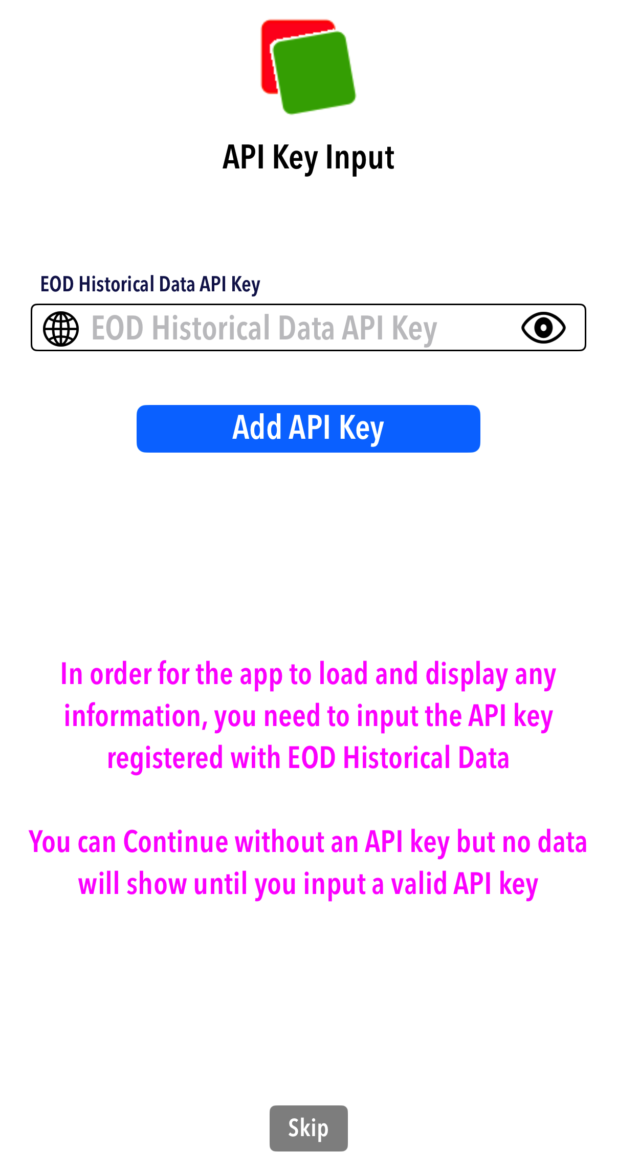 If its your first log in or you have cleared the API key from your device, you will be presented with a page to input your data provider API key